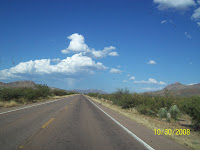 Yesterday I decided on a trip to Douglas , Arizona . Had to scratch that itch to move a bit , down highway 80 , a few miles and enter AZ , afew miles further and I spy an historical marker sign , almost passed when I see Geronimo Surrenders , I'll catch this on the way back ! Down the highway the road streches for miles ahead of me with long slow curves and a steady rise towards the mountains , up across the pass and down to Douglas a nice little border town with some very cool stores and a real grocery store and even a Walmart ! Shopping done I headed back to Rodeo by way of getting turned around on something called the PanAmerican Highway and spent a delighful hour getting turned around on the goat track that passes for a frontage road between Mexico and the U.S. The border guards didn't laugh too loudly and were actually pretty cool . NOTE :a PASSPORT is a good idea when dicking around in this part of the country ! Back on the highway I decided to fuel up , the only time you have too much fuel in the desert is when you are on fire ! Sipping on a fresh cup of coffee and tooling down the highway I see a sign that says Bisbee 22 miles , Oh shit ! Daydreaming again ! Turn around head back the other way soon a sign that says Lordsburg 74 miles , that's better , at least it's the direction I need . Back over the pass and soon here's the sign . I pull over and sure enough , here is where Geronimo surrendered , it's hard to imagine what it must have been like back then , ther ain't shit here now ! Wild country to be sure , the explanation lays to the other side of the road , the road bed of the Southern Pacific RR is still visible running straight as an arrow from Douglas to El Paso . Yes sir arrest those red devils , stick them on a train to Florida ! The actual surrender was in Skeleton canyon across the way , and I did drive back up in for a ways , it IS NOT where you want to take a motor home , but interesting all the same . From what I see now there is plenty of room for everybody here now , but those pesky fences and mines do make it hard to live off the land . At any rate I snapped a few pictures and then returned to Rusty's and made a dinner of pork and sauerkraut a southwestern specialty I have mastered, today I believe a trip to either Portal or over to the Animas Mercantile is in order ....